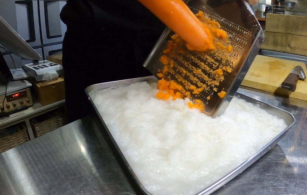 갈아낸 무와 당근 위에 달걀 노른자를 올리는 달인.