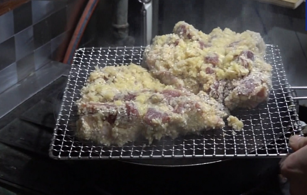 연기가 힘을 발휘하면 백된장에 숙성한 돼지고기가 올라가죠. 이렇게 훈연을 시킵니다