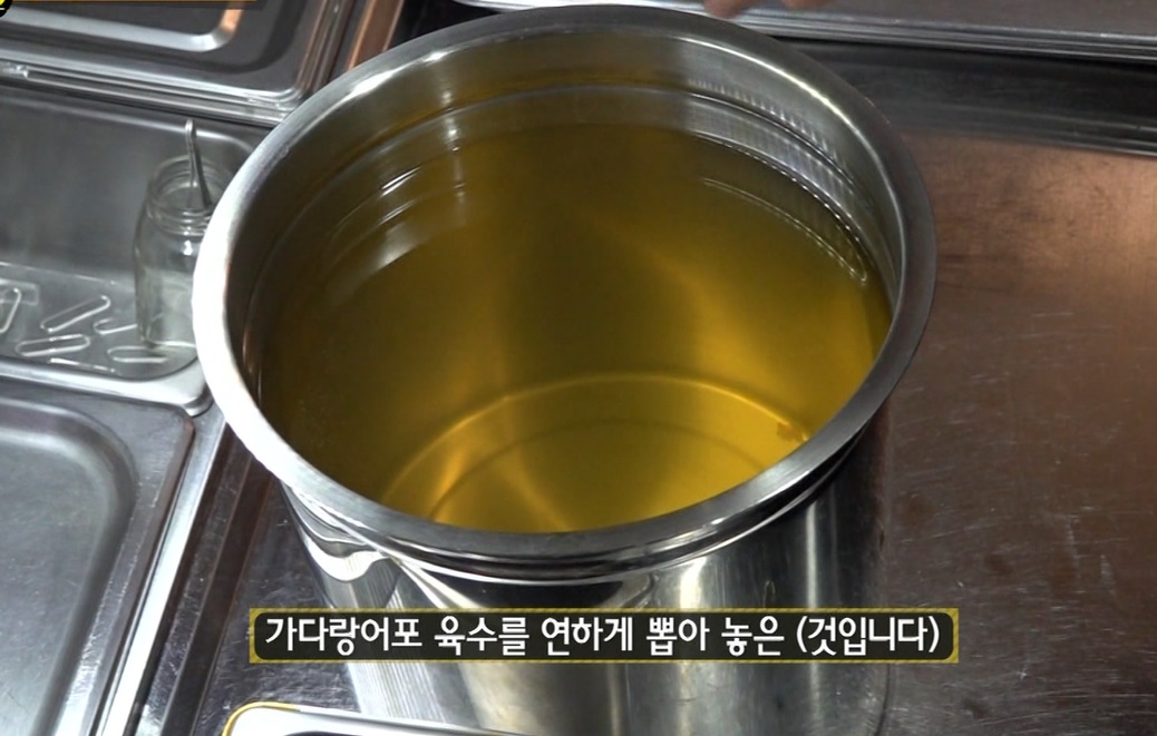 부드러운 속살과 감칠맛이 예술인 참돔 맛이 상상이 가니 육수가 기대되는 가운데 달인만이 알고 있는 공개 불가 육수에 넣고 본격적으로 맛을 우려내주는데요.
