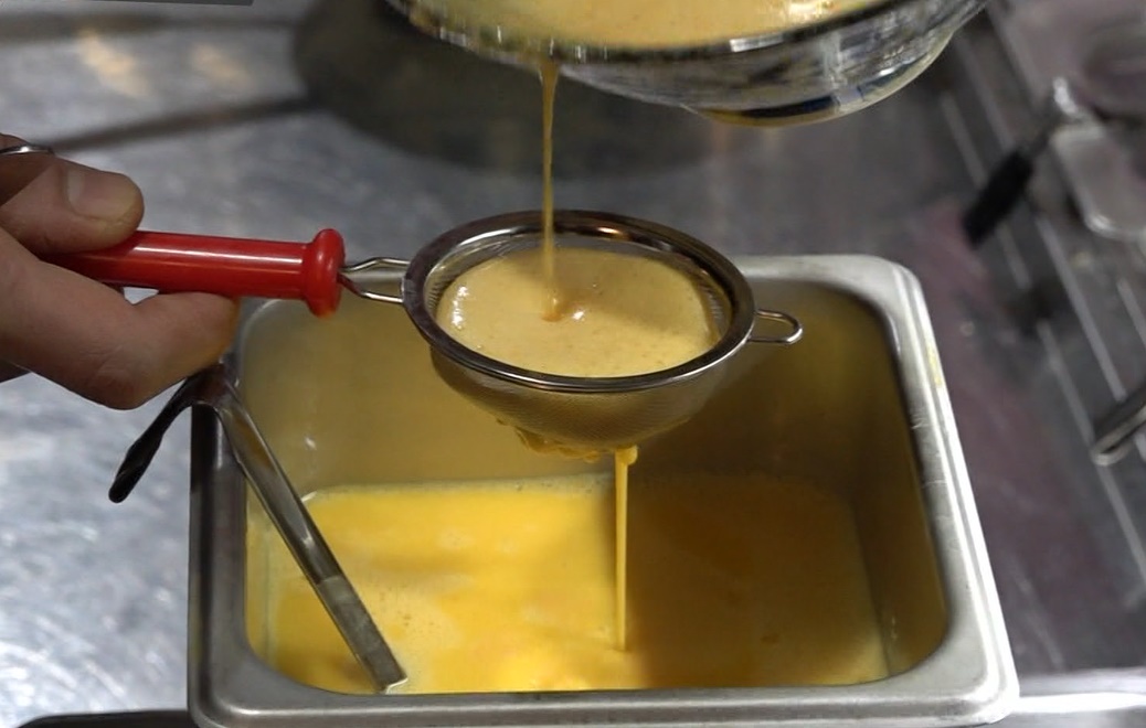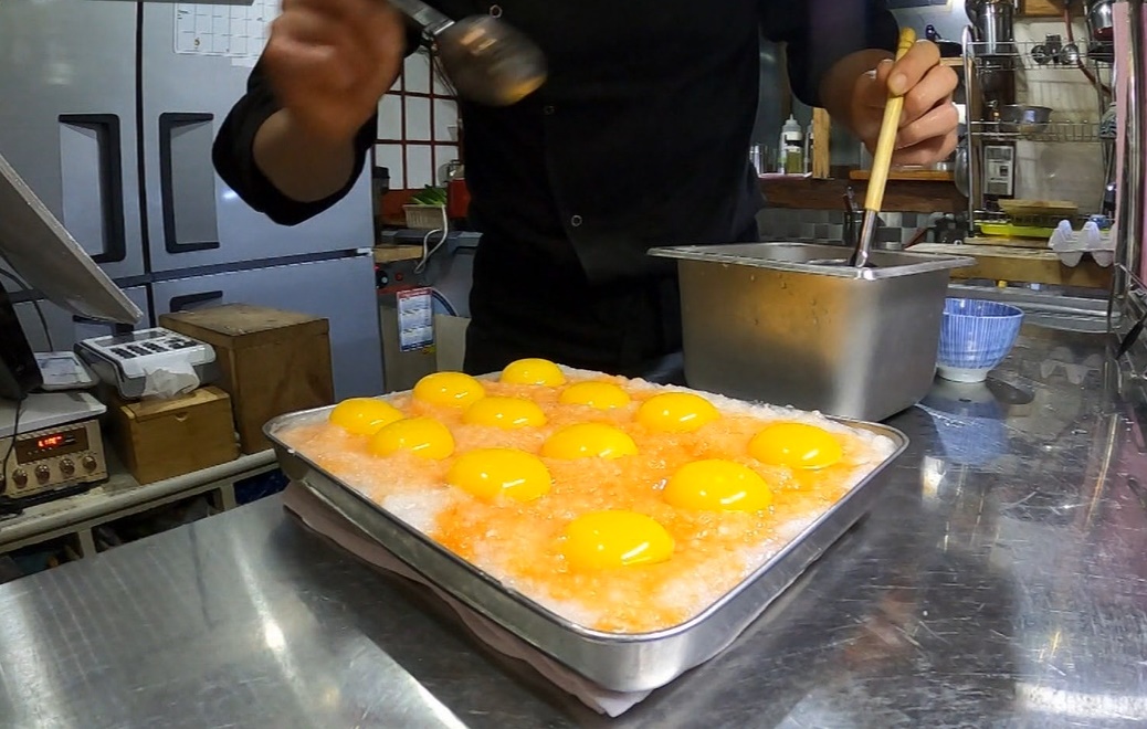 달걀말이를 만들때 신선한 달걀과 숙성 달걀 두 가지를 쓴다는 달인. 이게 노른자만 따로 걸러 숙성한 달걀인데요.