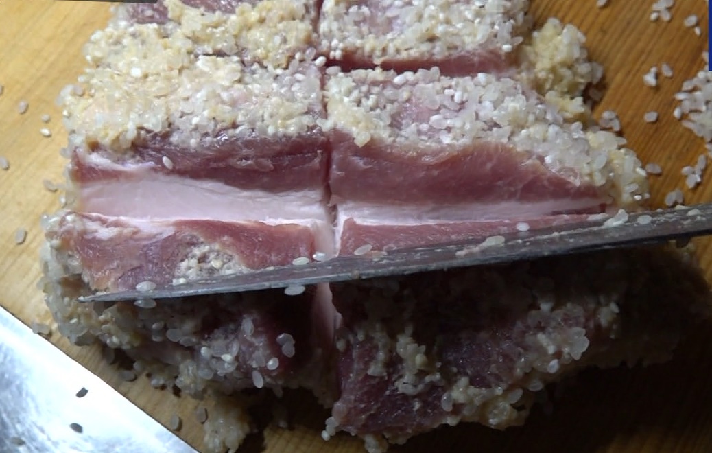 숙성이 잘 돼 선홍빛으로 거듭난 돼지고기는 듬성듬성 썰어 틈을 만들어준 후 제3의 재료가 등장하는데.