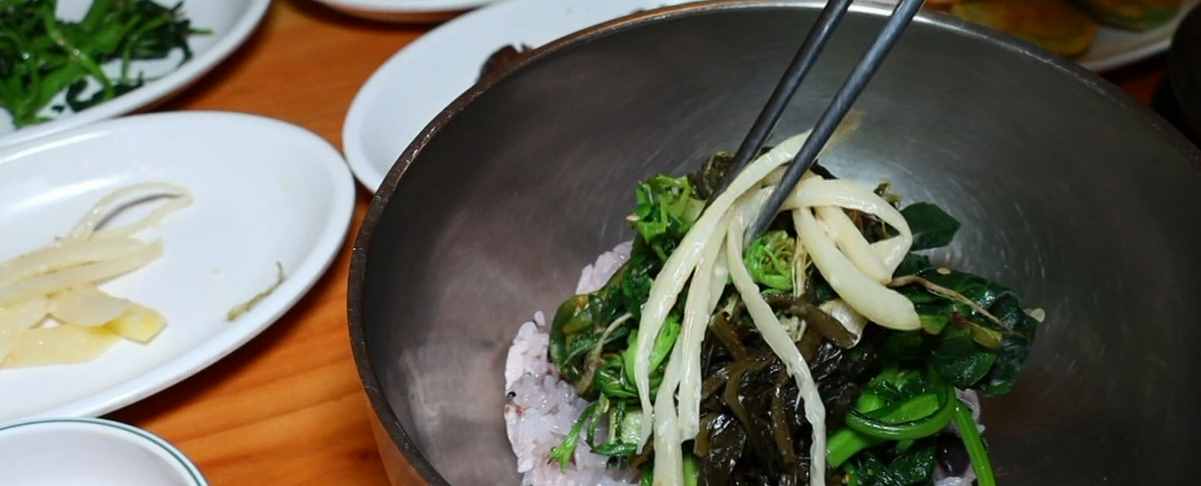입맛 돋우는 봄나물 비빔밥의 비결은 첫째도 둘째도 싱싱함이 생명. 당일 쓰는 봄나물을 매일 정성껏 준비한다는 사장님. 봄나물의 종류도 매번 달라진다고요. 깨끗한 물로 목욕 재개한 봄나물은 특유의 향을 살리기 위해 숙련된 기술로 삶아내는 것이 중요하고요.