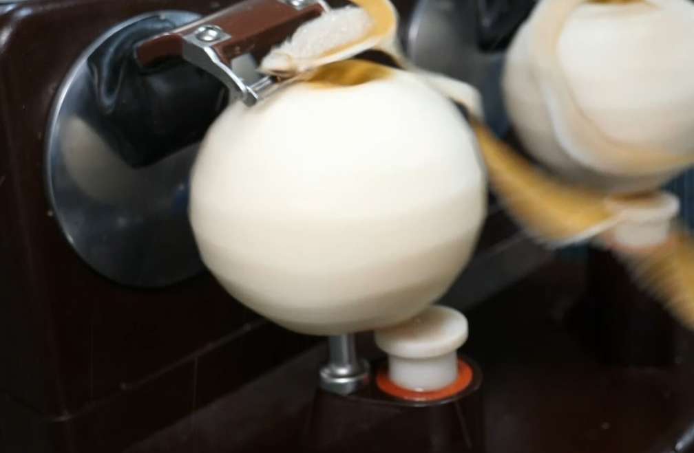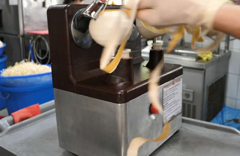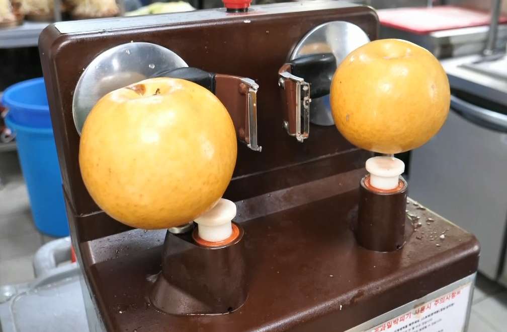 배를 깎을 때는 시간이 많이 걸려서 회오리감자 처럼 배의 껍질을 까는 기계를 사용하고 있다고요.