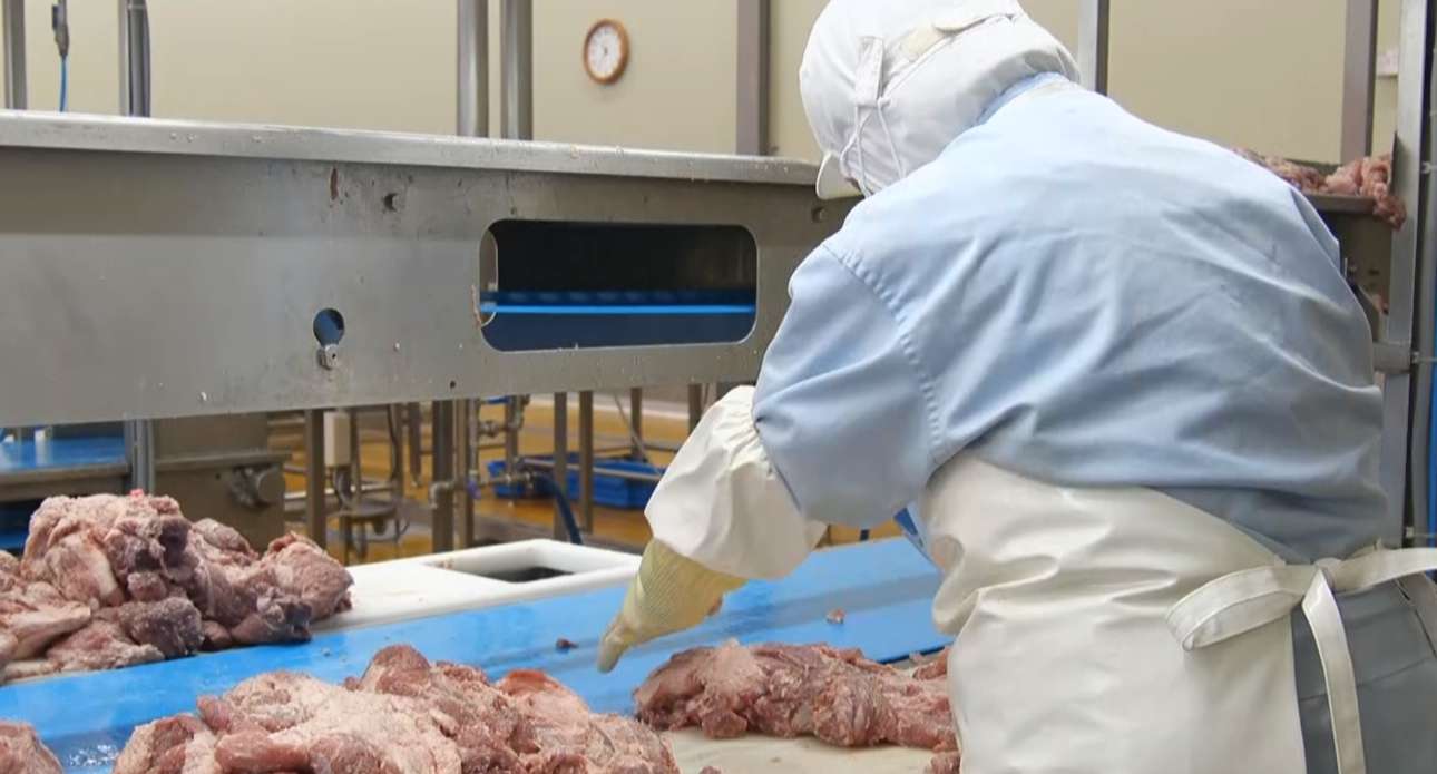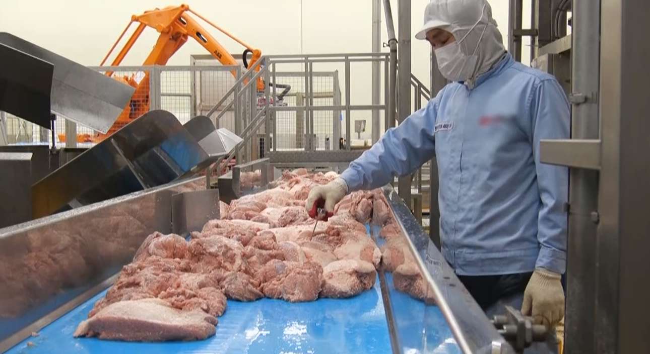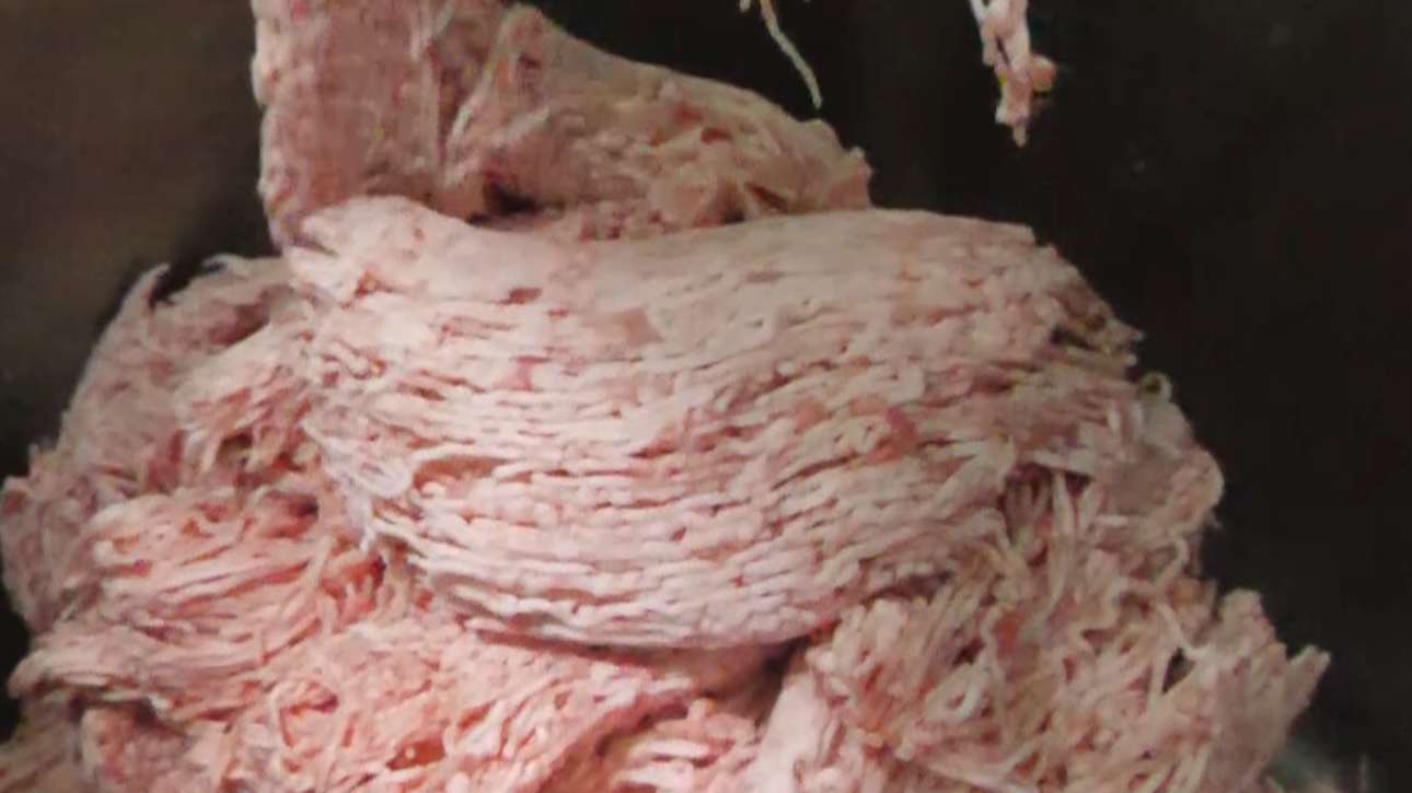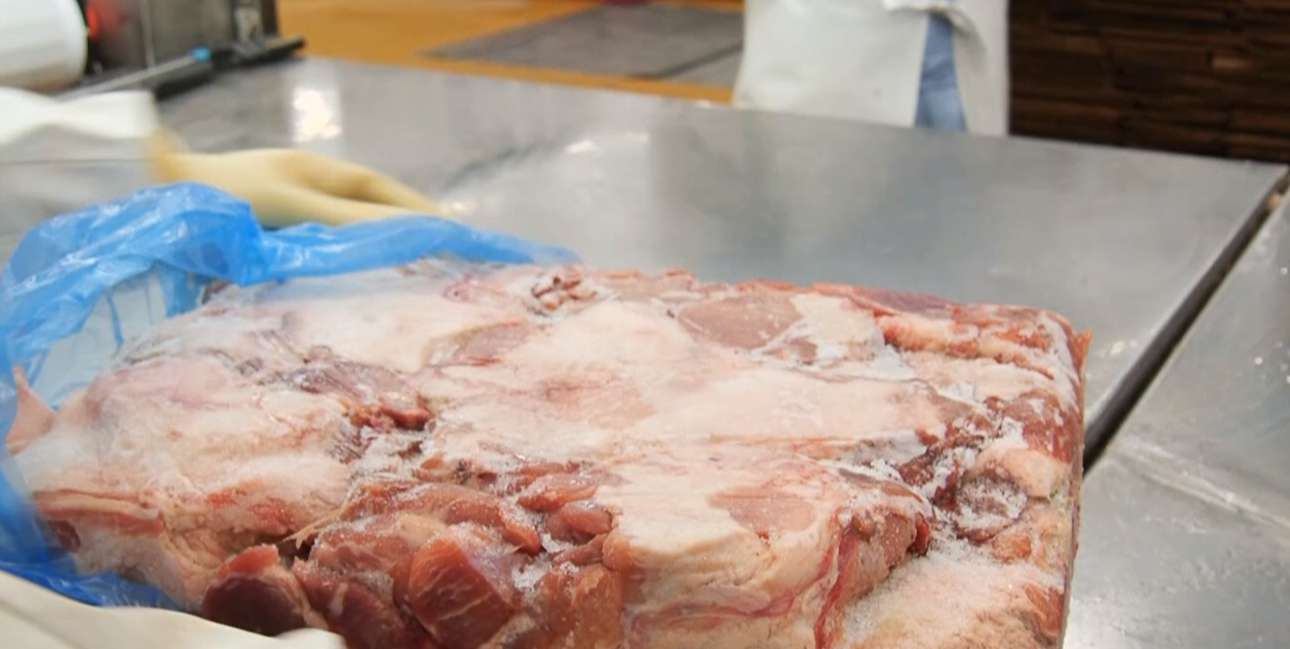 자, 두 번째 공정입니다. 이제 돼지고기를 손질해 줄 차례인데요. 살코기 속에 숨은 뼈, 껍질 등 이물질을 제거하는 과정입니다. 정교한 손놀림이 필요한 작업이죠.