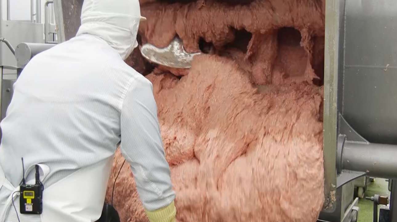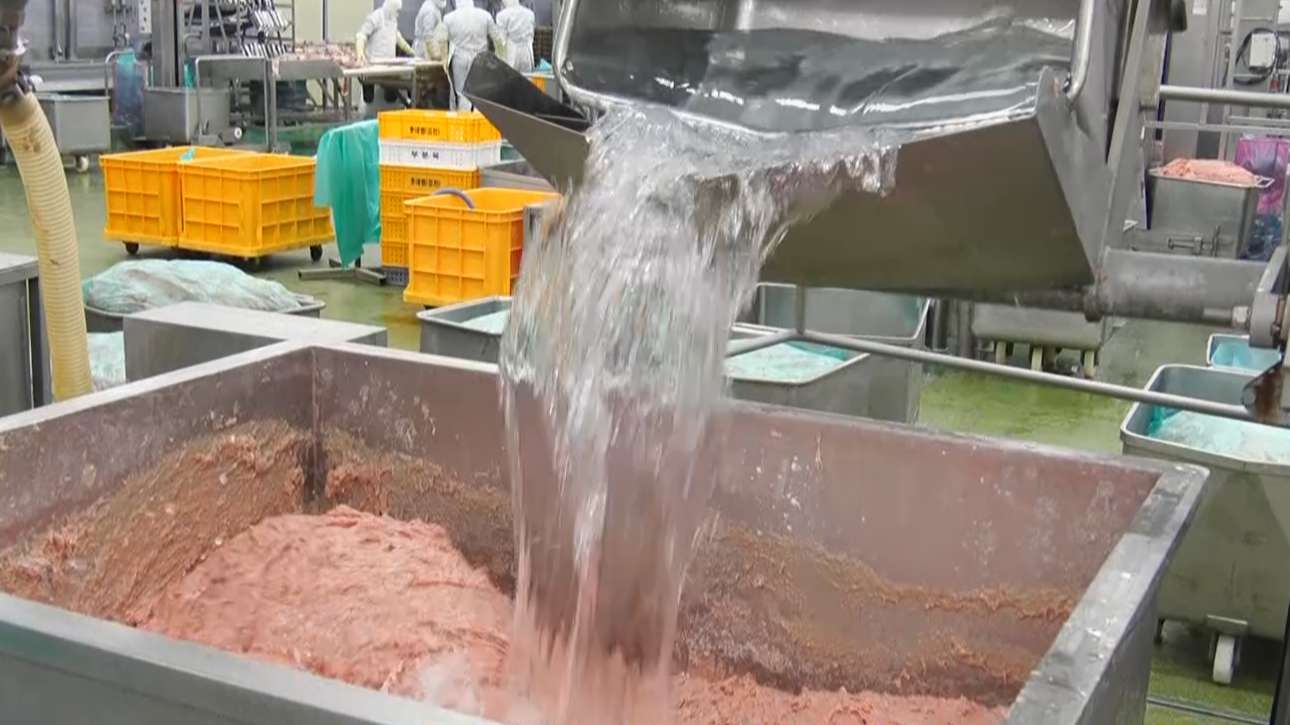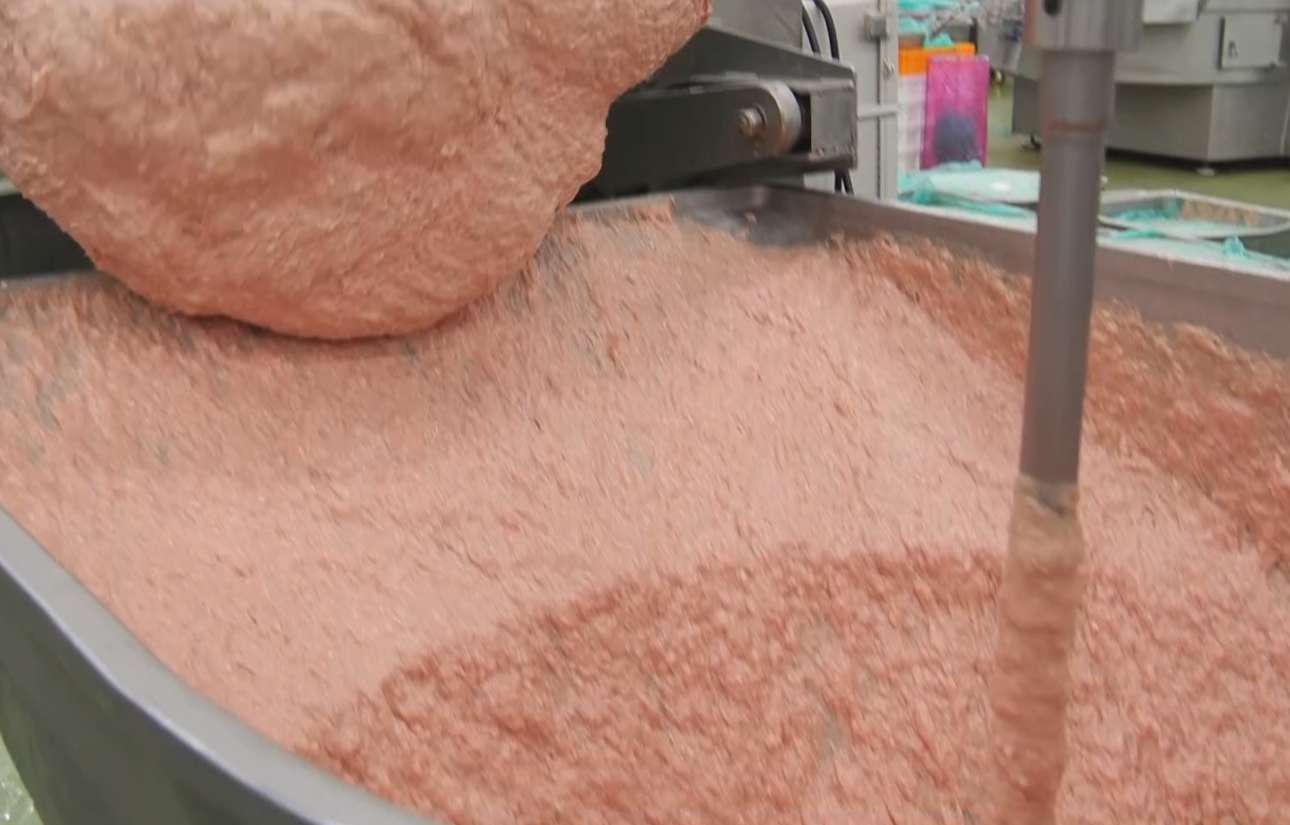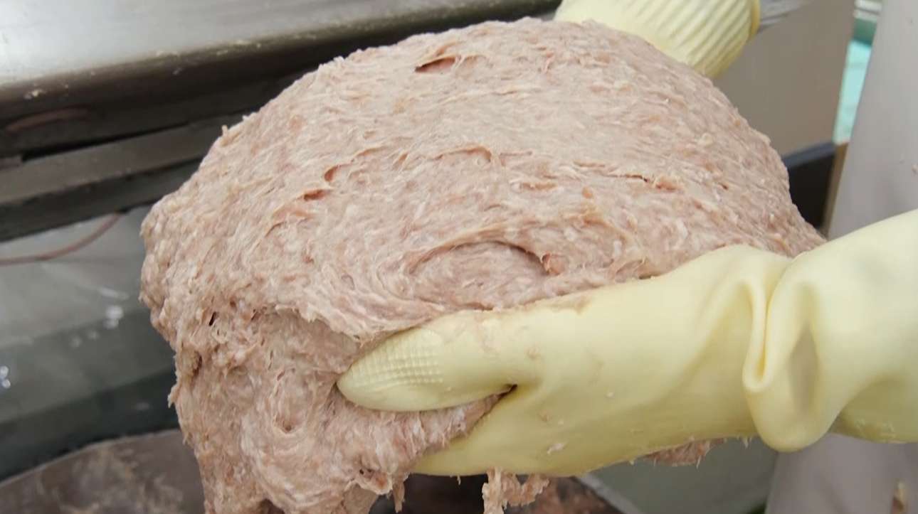 다음은 배합 공정으로 넘어갑니다. 여기에 아주 섬세한 기술이 숨겨져 있다는데요. 철저한 온도 관리는 생명. 배합육의 온도가 올라가면 신선도를 잃기 때문에 작업자들의 각별한 주의가 필요합니다. 긴 시간 끝에 배합육이 완성됐습니다.