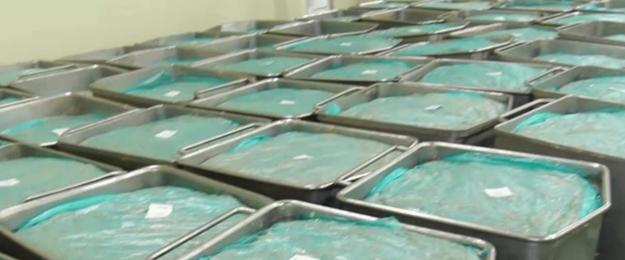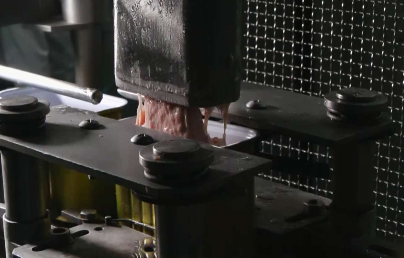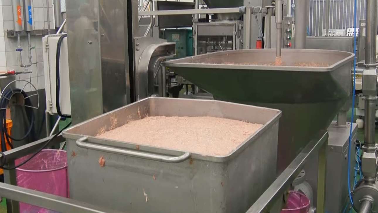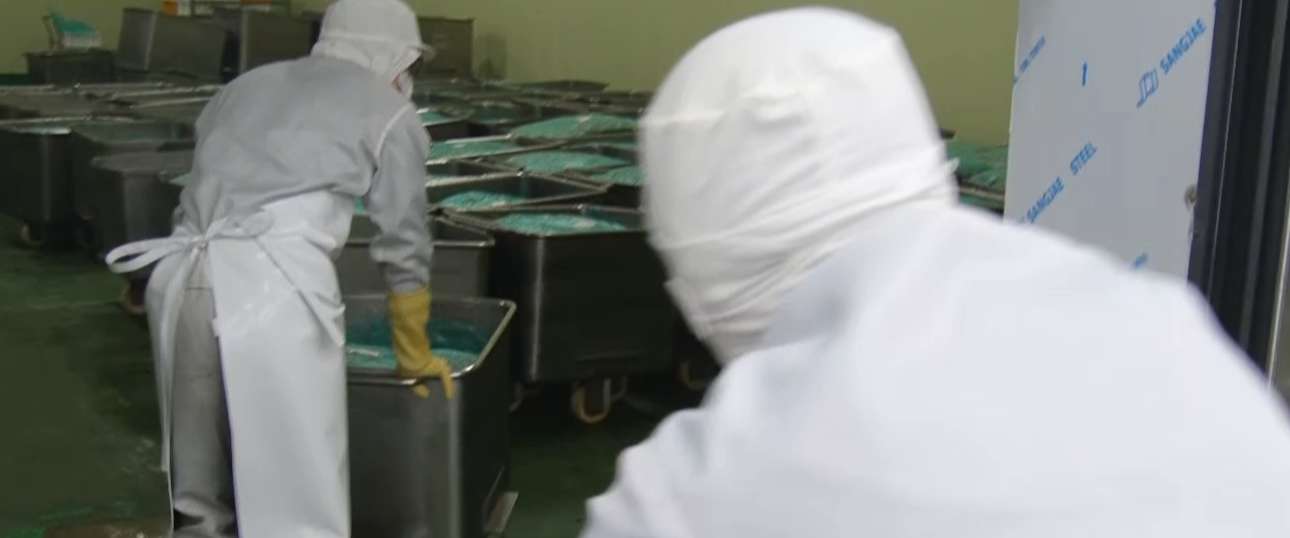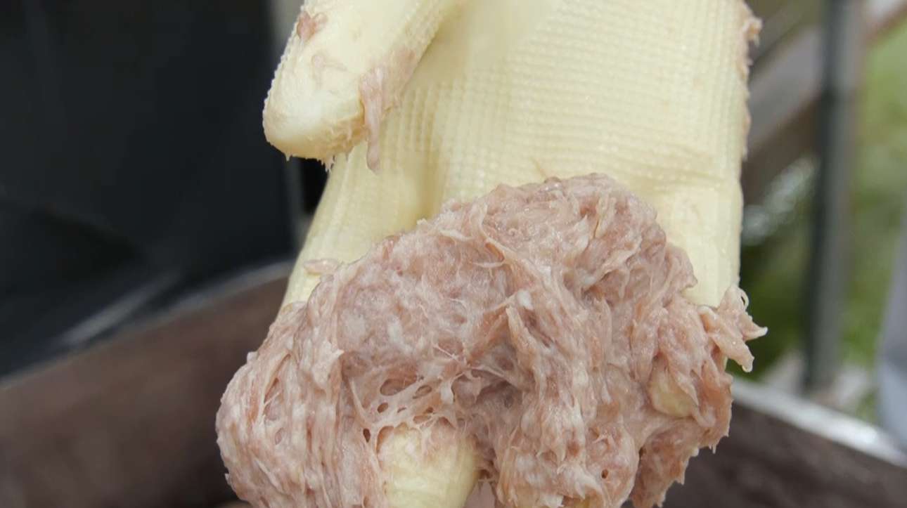 다음은 배합 공정으로 넘어갑니다. 여기에 아주 섬세한 기술이 숨겨져 있다는데요. 철저한 온도 관리는 생명. 배합육의 온도가 올라가면 신선도를 잃기 때문에 작업자들의 각별한 주의가 필요합니다. 긴 시간 끝에 배합육이 완성됐습니다.