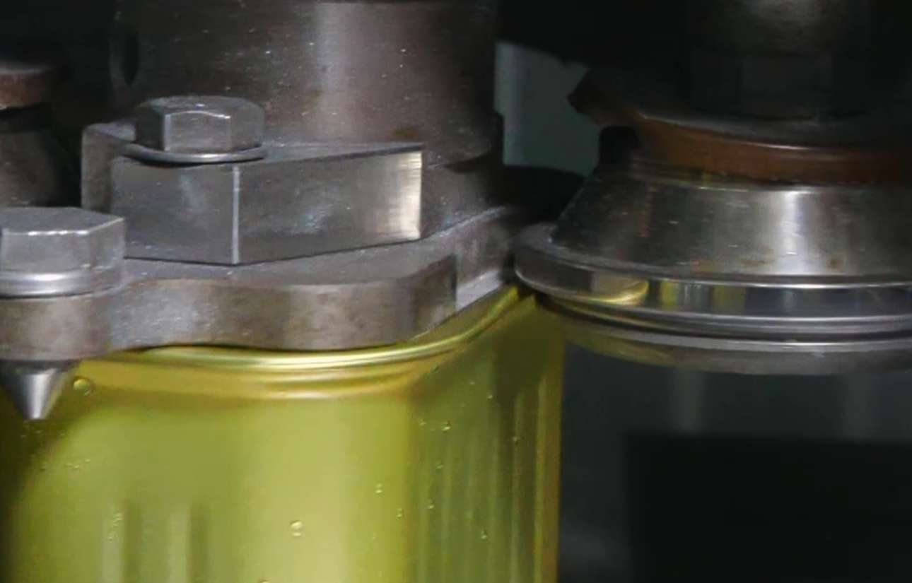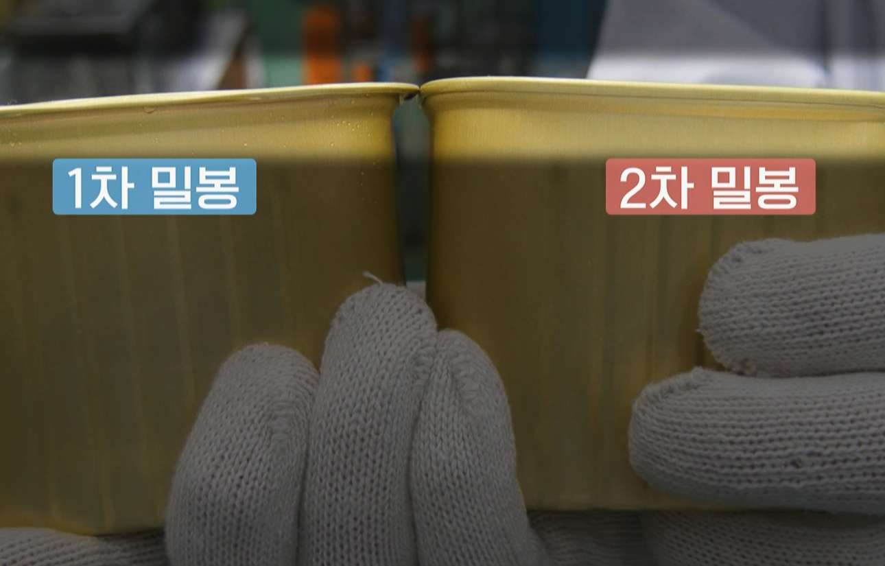 이제 밀봉시켜줄 차례. 배합륙을 담은 캔과 뚜껑을 단단히 결합시켜주는데요. 한 번으로 끝나는 게 아니랍니다.