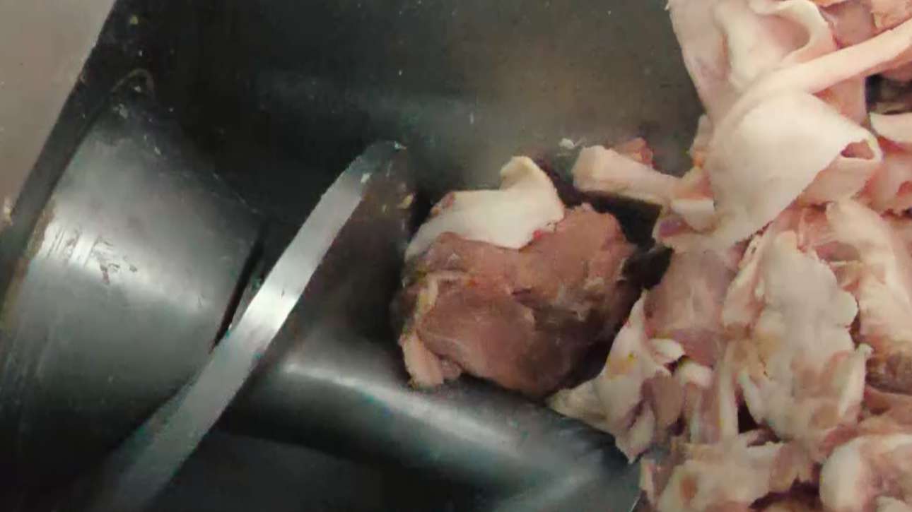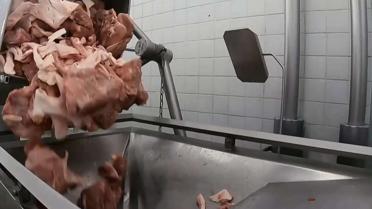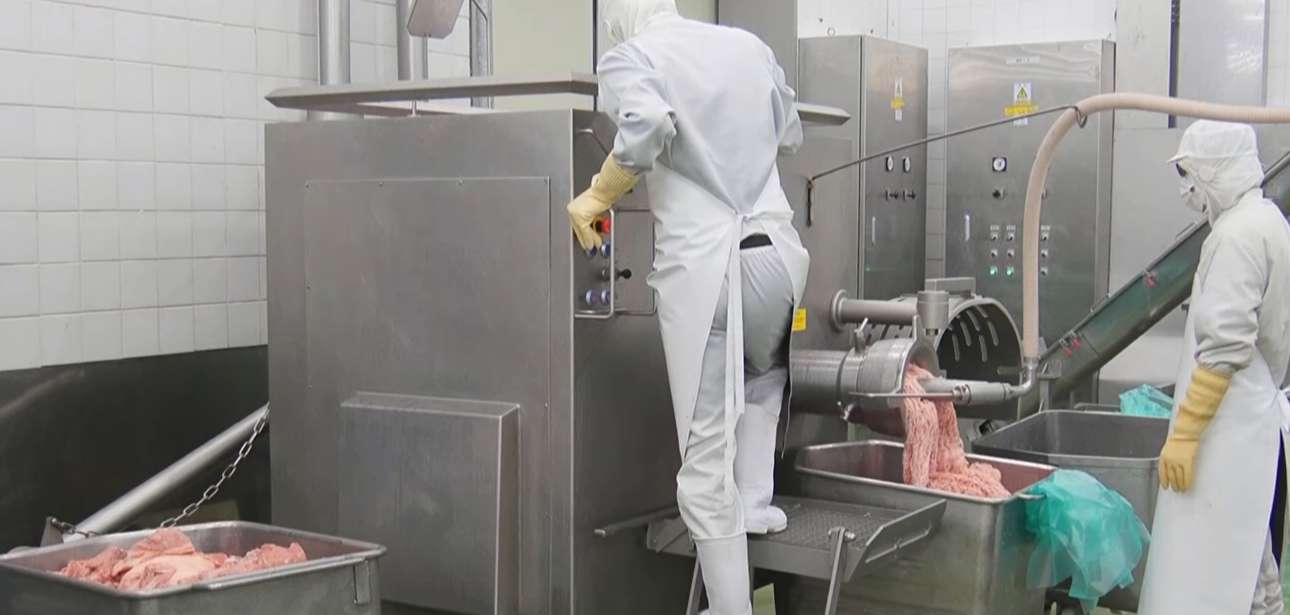 다시 생산 현장입니다. 작업 준비가 한창인데요. 이제 세 번째 공정, 분쇄. 돼지고기의 원형 상태로는 햄을 만들 수 없겠죠. 분쇄기 안으로 투입시켜 잘게 갈아주는 과정입니다.