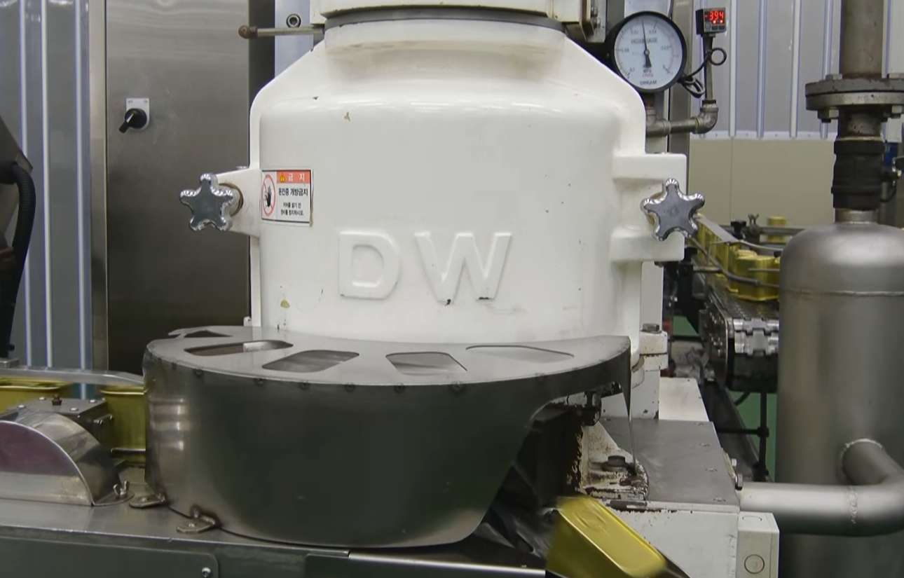 그런데 그때 갑자기 문이 닫힙니다. 압력을 더해 진공 상태로 만든다는데요. 기포를 제거하면 재료들이 더 균일하게 섞이면서 결착력을 증가시혀준다는군요.