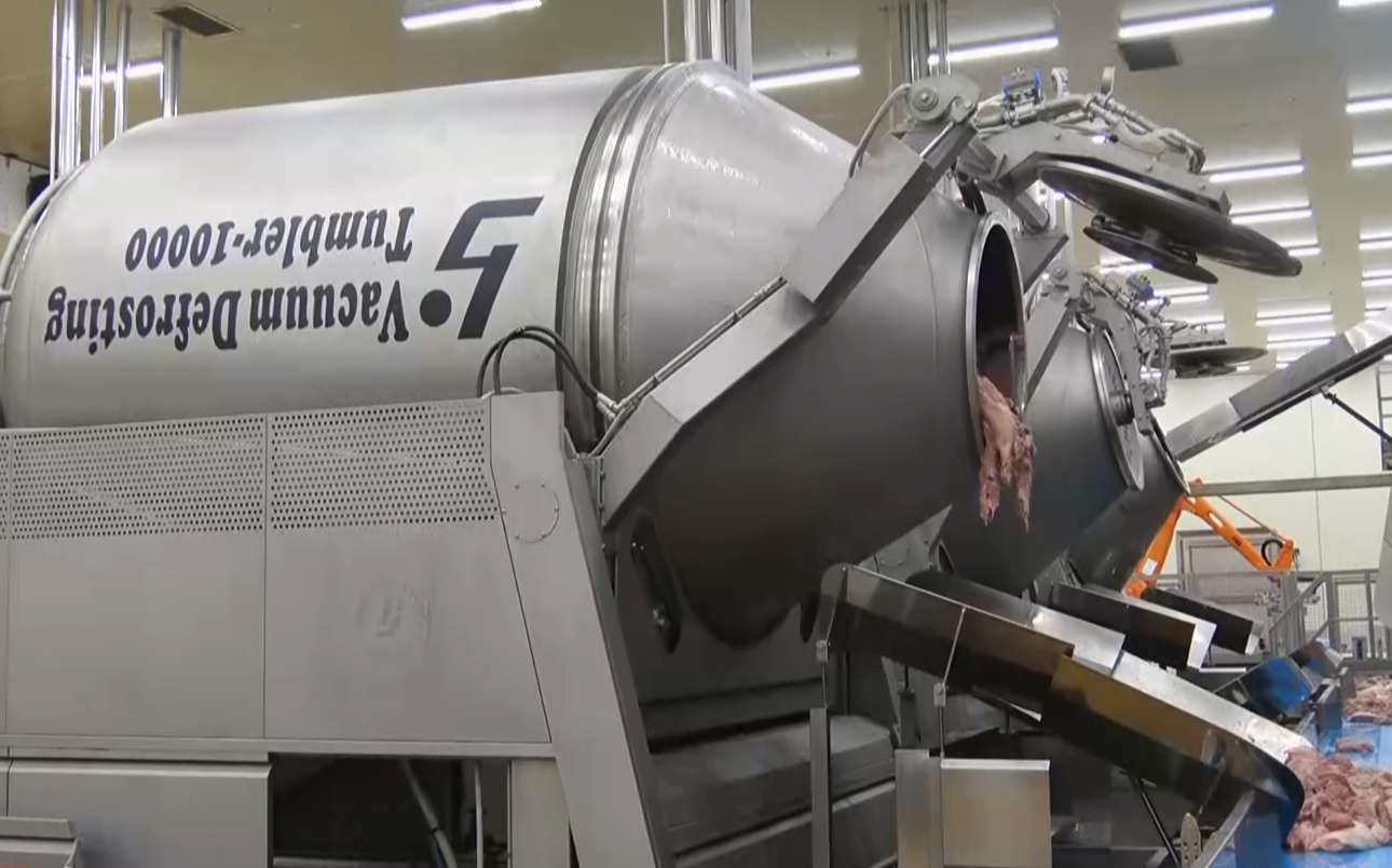 해동시간을 줄여야만 그만큼 고기의 신선도가 올라가기 때문에 지금부터는 속도전 이랍니다. 해동시키는 방식도 꽤 재미있는데요. 원형 탱크 안에서 위아래로 돌려가며 원육의 온도를 맞춰준다는군요.