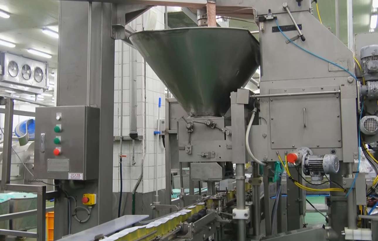 이제 모든 준비는 완료됐습니다. 본격적인 충진 공정을 앞두고 있는데요. 먼저 배합육을 실은 배차를 충진 설비에 장착시켜줍니다. 대형 깔대기 안으로 배합육이 들어가면 동시에 밸브를 통해 이동하는 방식인데요. 여기서 이물질까지 걸러낸다는군요.